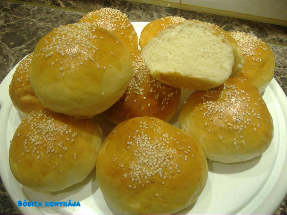 Amikor megkelt kiformázzuk a zsemléket és még 30 percig pihentetjük a zsemléket. Felvert tojással megkenjük őket majd szezámmagot szórunk rá. Előmelegített sütőben 180° kb. 20 percig sütjük.